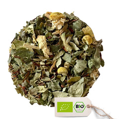 (100% biologisch): Ingwerwurzel, Kamillenblüten, Frauenmantelkraut, Fenchel, Rotbuschtee, Passionsblume und Melisse
