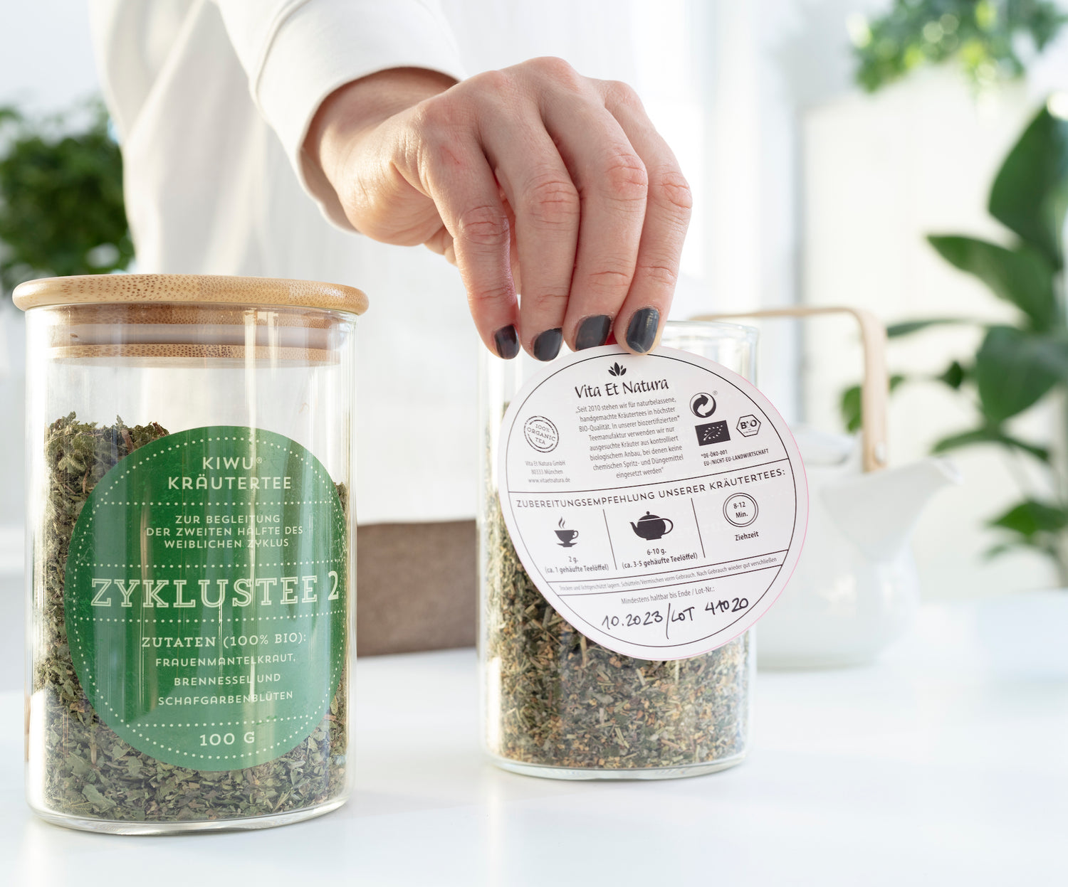Wenn dein Tee aufgebraucht ist, kannst du das Etikett einfach entnehmen und das Vorratsglas mit einer anderen Vita Et Natura Teesorte befüllen – für die Kennzeichnung des neuen Inhalts verwende einfach unsere Tüten-Etiketten. Somit kannst du all unsere Tees im selben Gefäß aufbewahren: Das spart Platz, Kosten und Müll