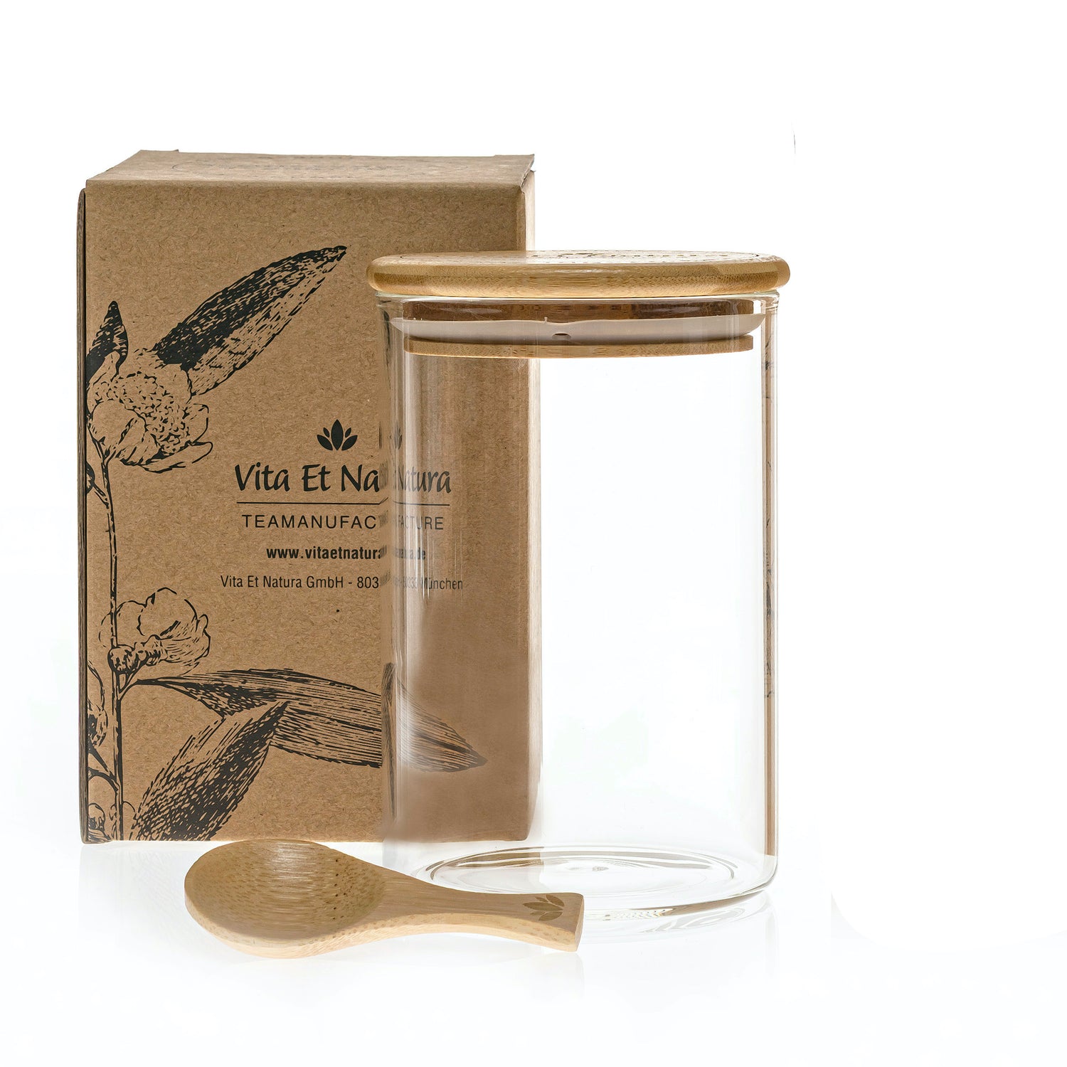 Pflegehinweis: Das Glas ist hitzebeständig und spülmaschinengeeignet – der Bambus-Deckel samt Silikonverschluss, ebenso wie der Dosierlöffel sollten jedoch per Hand gewaschen werden.