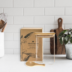 Pflegehinweis: Das Glas ist hitzebeständig und spülmaschinengeeignet – der Bambus-Deckel samt Silikonverschluss, ebenso wie der Dosierlöffel sollten jedoch per Hand gewaschen werden.