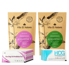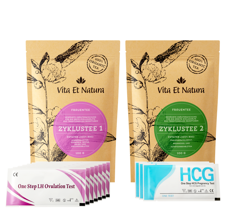 Probier-Sparpaket für die Hibbelphase: enthält unsere bewährten Zyklustees 1 & 2 sowie praktische LH-Ovulations- und Schwangerschaftstest-Streifen. Die LH-Tests kündigen den Eisprung ca. 24–63 Stunden nach positivem Ergebnis an; 2 Tage nach positivem Ovulationstest von Zyklustee 1 auf Zyklustee 2 wechseln. Die Schwangerschaftstests sind hoch empfindlich (10 miu/ml).