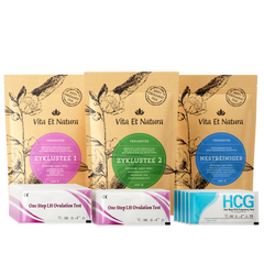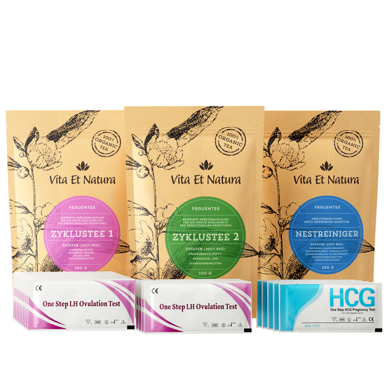 Komplettpaket für die Hibbelphase: enthält unsere bewährten Zyklustees 1 & 2, Nestreiniger sowie LH-Ovulations- und Schwangerschaftstest-Streifen. Die LH-Tests kündigen den Eisprung ca. 24–63 Stunden nach positivem Ergebnis an; 2 Tage nach positivem Ovulationstest von Zyklustee 1 auf Zyklustee 2 wechseln. Die Schwangerschaftstests sind hoch empfindlich (10 miu/ml).